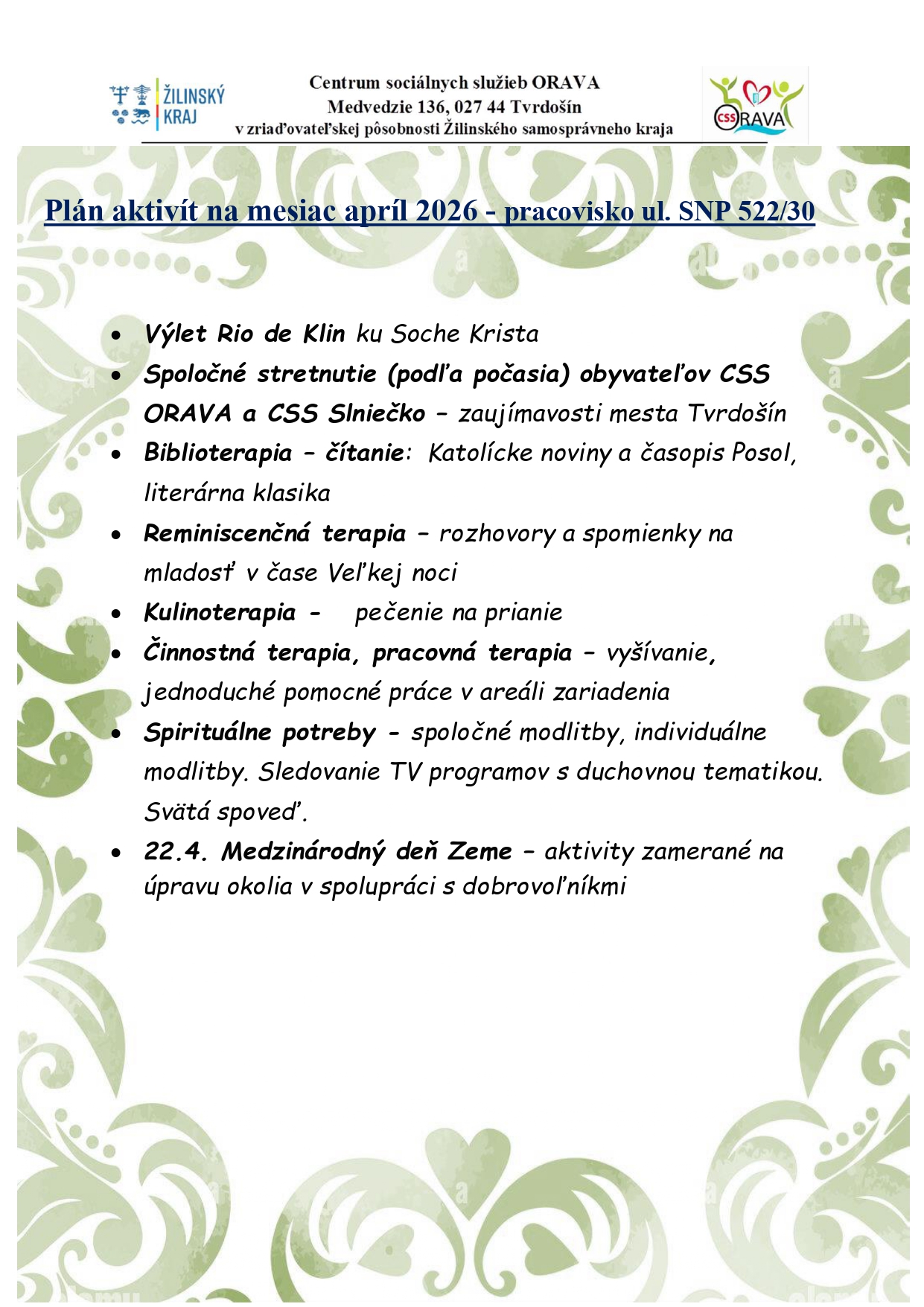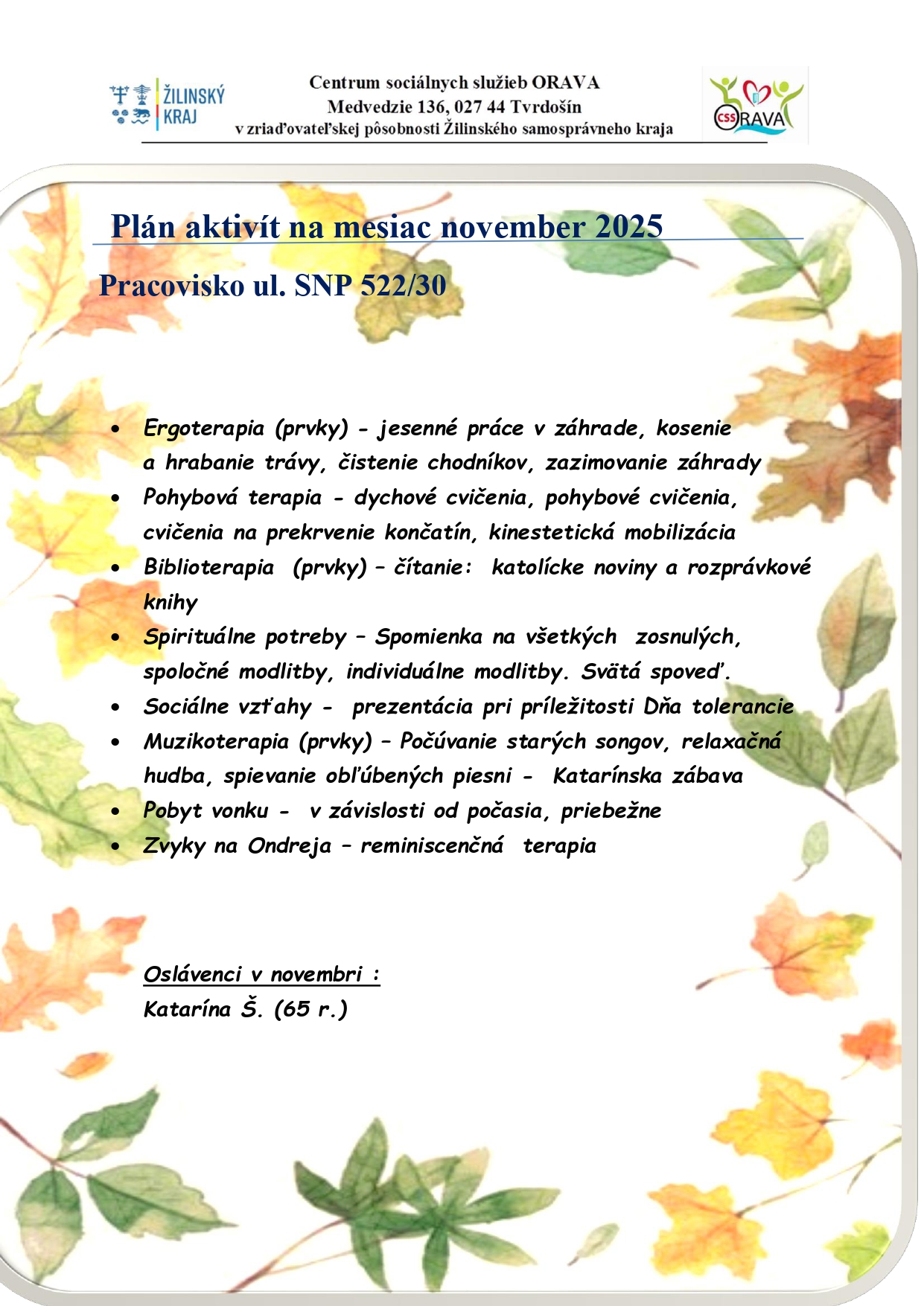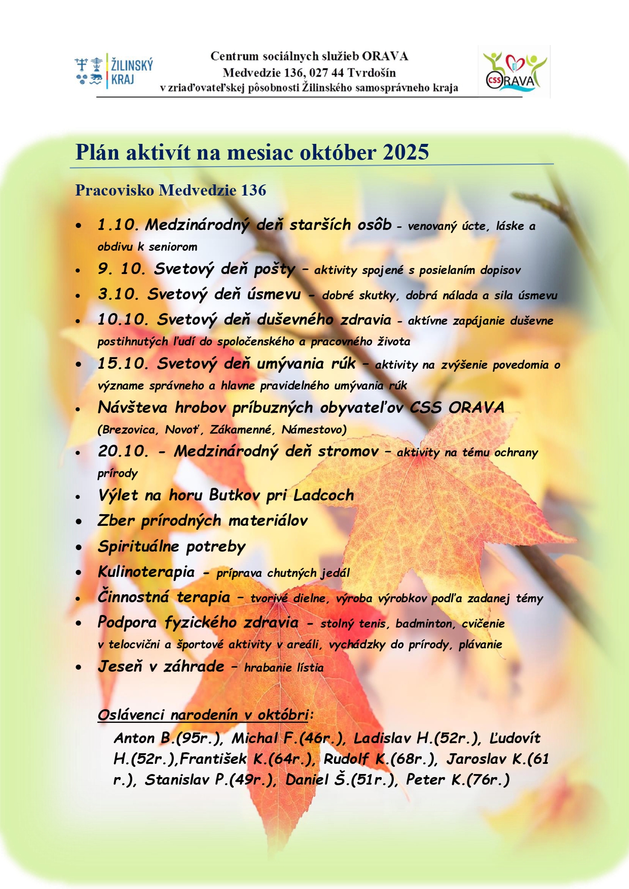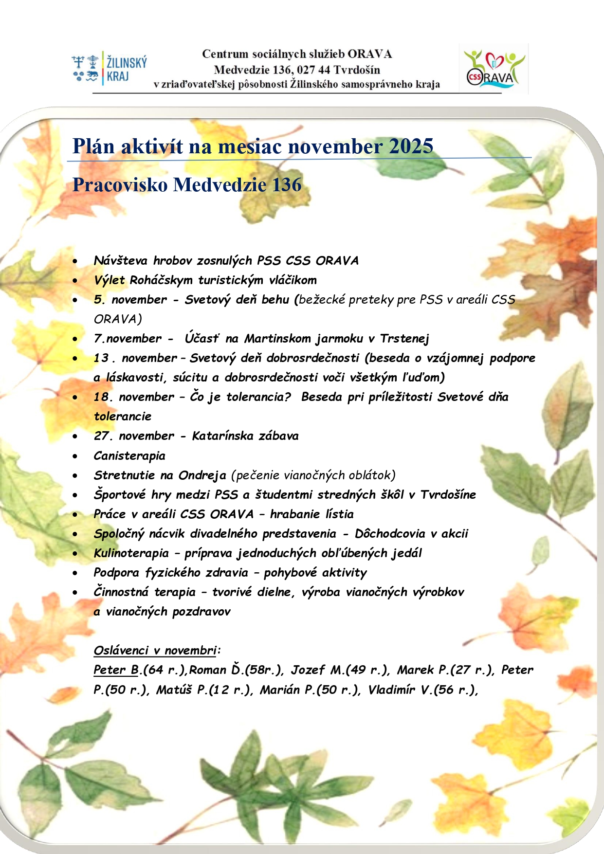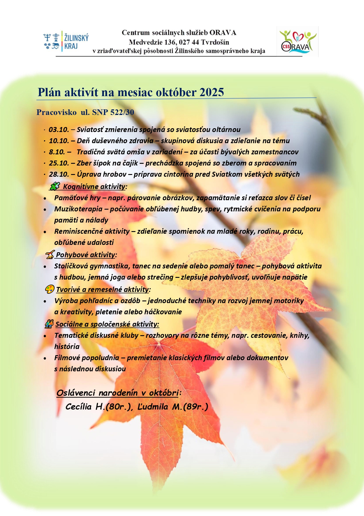 Plán aktivít na mesiac
